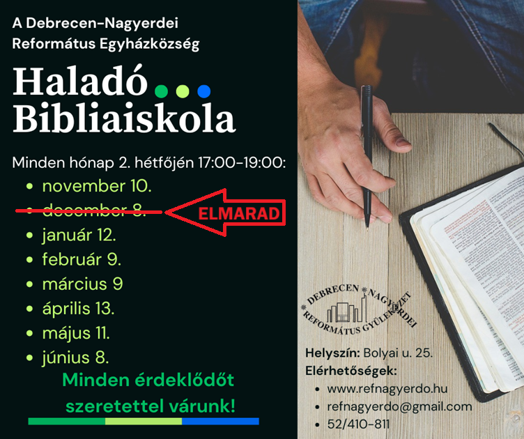 A Haladó Bibliaiskola decemberi (12.08.) alkalma elmarad.