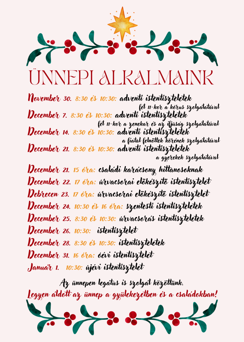 2025.12.01Gyülekezeti kirándulás 2026.Szeretettel hívogatjuk a gyülekezetünk tagjait 2026. április 10-12. között egy gyülekezeti kirándulásra, amelyen a Felvidéken barangolhatunk.A kirándulás programterve a ...Bővebben »2025.11.28SzeretetdobozAhogyan a korábbi években, idén is bekapcsolódunk a Magyar Református Szeretetszolgálat karácsonyi adománygyűjtő akciójába. Az átriumban kitett szeretetdobozba szeretettel ...Bővebben »2025.11.27Star Wars: Egy új remény - Református filmestSzeretettel várunk minden érdeklődőt egy különleges református közösségi filmestre, ahol együtt nézzük meg a Star Wars – Egy új remény című filmet, majd beszélgetünk a történet ...Bővebben »