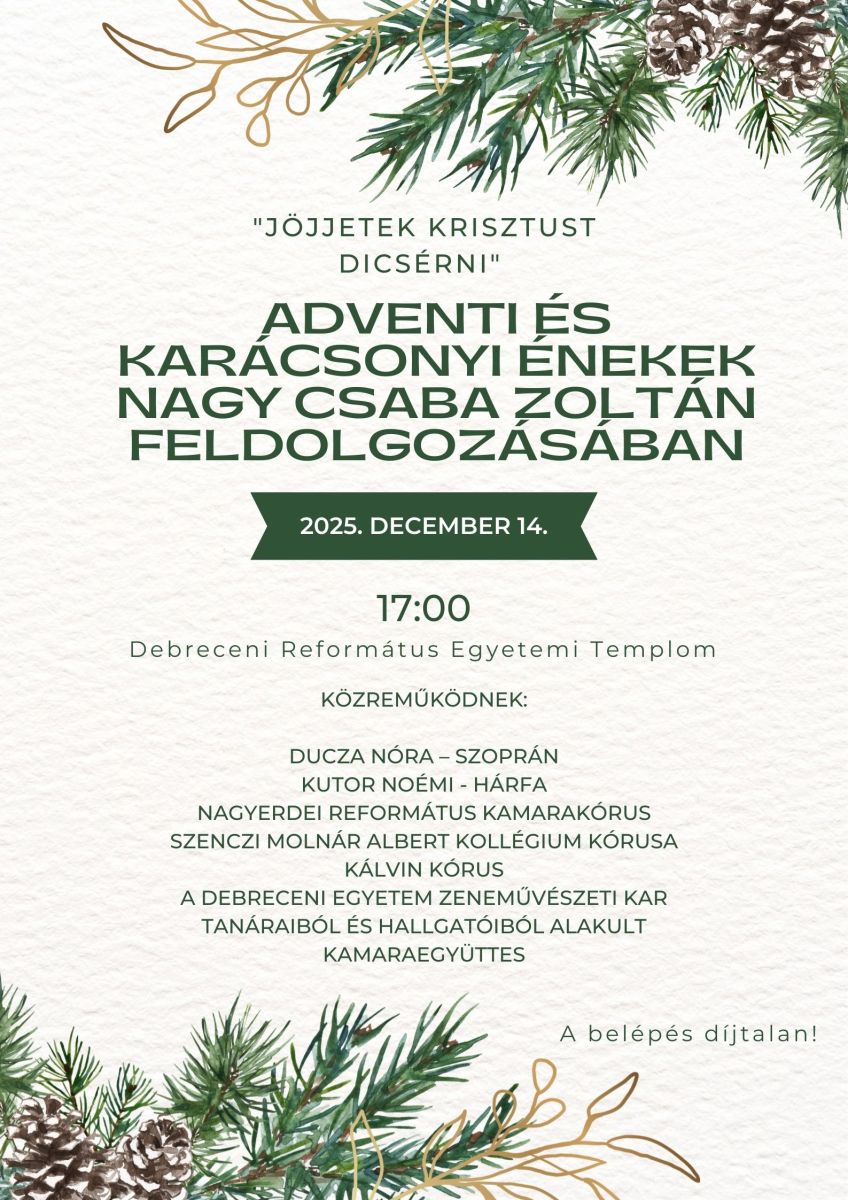 2025.12.02ELMARAD! a Haladó BibliaiskolaA Haladó Bibliaiskola decemberi (12.08.) alkalma elmarad.A sorozat január 12-én folytatódik.Bővebben »2025.12.01Gyülekezeti kirándulás 2026.Szeretettel hívogatjuk a gyülekezetünk tagjait 2026. április 10-12. között egy gyülekezeti kirándulásra, amelyen a Felvidéken barangolhatunk.A kirándulás programterve a ...Bővebben »2025.12.01Karácsonyi ünnepi rendÜnnepi alkalmainkra mindenkit szeretettel várunk! Bővebben »